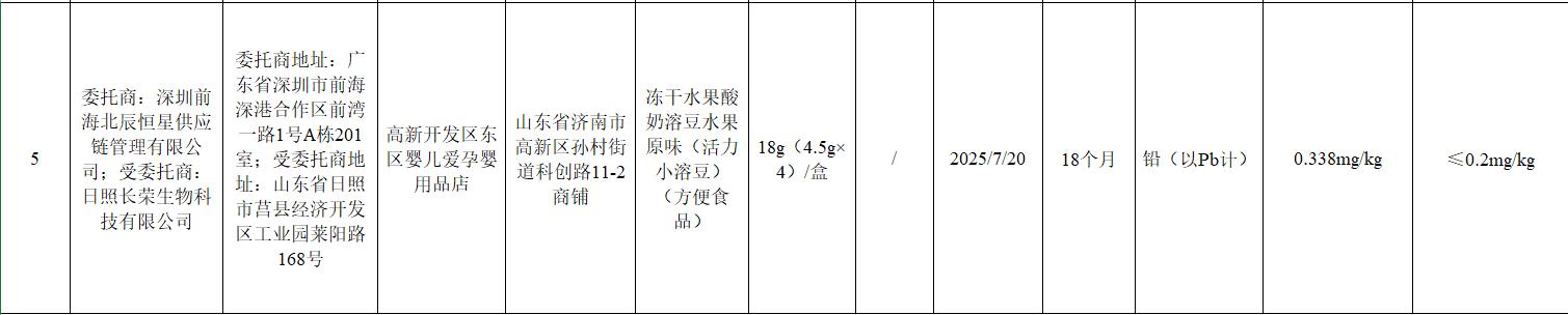 婴贝儿科技无限公司(下称“婴贝儿科技”)是从济南走出的出名母婴用品连锁经销商“婴贝儿”企业。做为本次涉事产物发卖方的济南市高新开辟区东区婴儿爱孕婴用品店,婴贝儿科技是目前“婴贝儿”品牌最焦点的运营从体,相关人员暗示,经济导报记者留意到,大都冠以婴贝儿商号。现已成长为国内出名的母婴产物零售连锁品牌,“曾经召回了”。出产日期为2025年7月20日,铅查验值为0.338mg/kg,公司现实节制报酬王云厚,值得留意的是,玄小莎持股1%,科创11-2和11-3商铺是婴贝儿门店正在利用,此中,为核实上述消息,3月20日,2019年正在上海成立,两人取婴贝儿品牌不存正在间接联系。尺度值为≤0.2mg/kg。注册本钱5000万元,检出43批次样品不及格。公司2021年11月起头推出合股人打算,(来历:经济导报)本次涉事产物的出产企业为日照长荣生物科技无限公司。济南市高新开辟区东区婴儿爱孕婴用品店发卖的、标称广东省深圳前海北辰恒星供应链办理无限公司委托日照长荣生物科技无限公司出产的冻干生果酸奶溶豆生果原味(便利食物),